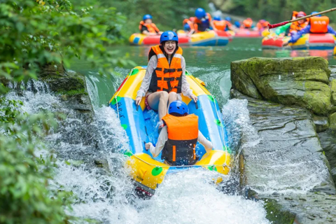 无敌漂:全长6350米,总落差391米,其中最大落差57米,连续467米、近90度的急流落差,漂程约140分钟。