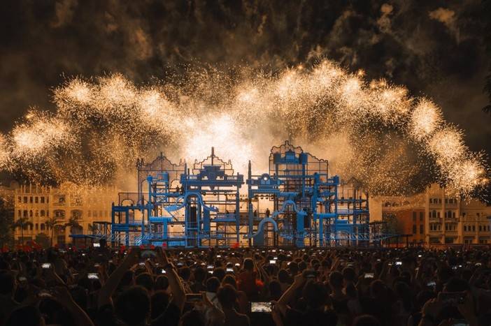 夜幕降临,大型的表演《百年火秀》更是引起景区内气氛的高潮,赤坎华侨古镇每晚有烟火汇演、火壶表演、 打铁花活动,“火秀”水上非遗打铁花,是一种传统的民间表演艺术,通过将炽热的铁水舀起以击打的方式,让铁水在空中飞溅形成绚丽的火花,营造出璀璨夺目的视觉效果。