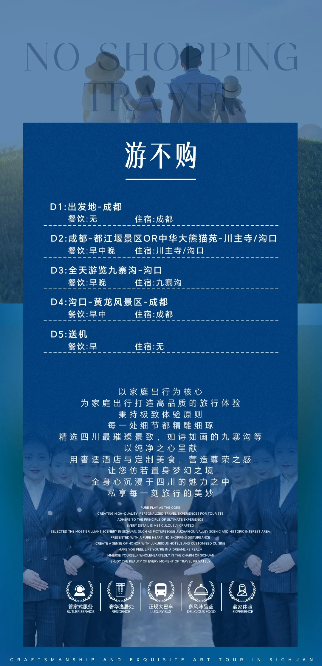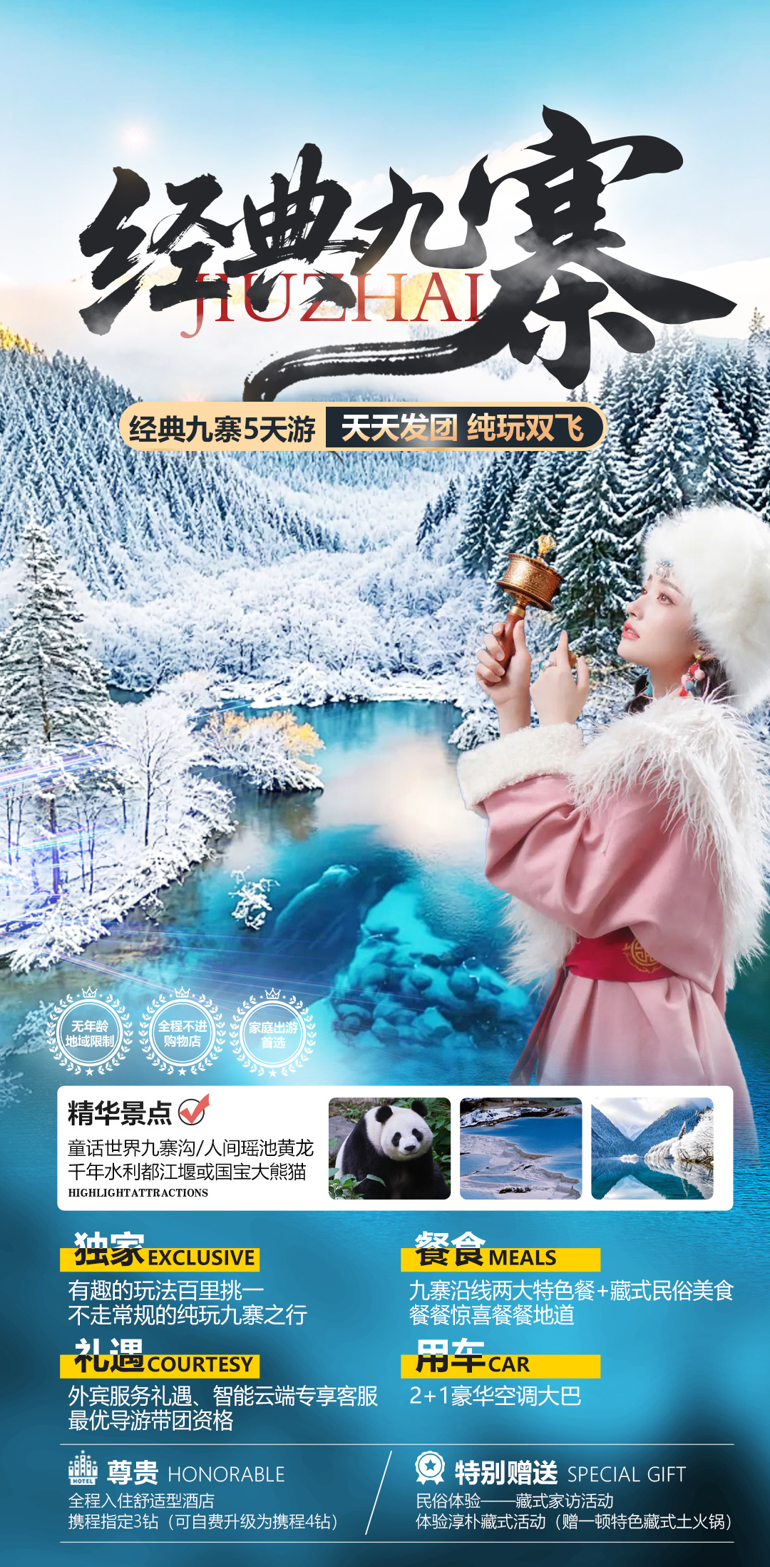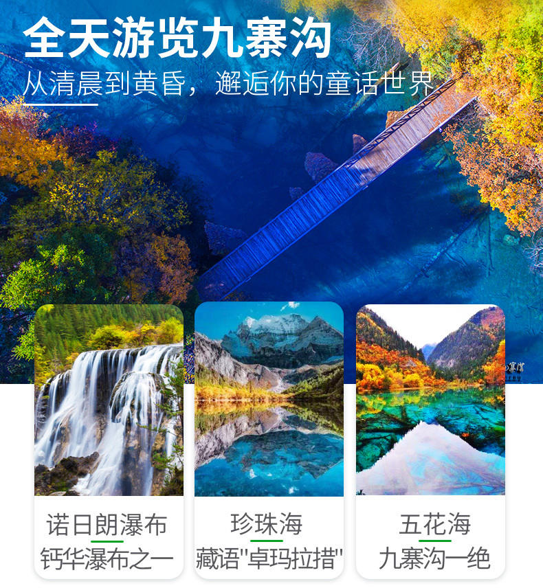 [游览] — 九寨沟风景区、黄龙风景区、都江堰风景区or中华大熊猫苑 [尊贵] — 全程入住舒适型酒店,携程指定3钻(可自费升级为携程4钻) [纯粹] — 无年龄地域限制,全程不进购物店 [独家] — 有趣的玩法百里挑一,不走常规的纯玩九寨之行 [餐食] — 九寨沿线两大特色餐+藏式民俗美食 [礼遇] —最优导游带团资格、陆地头等舱2+1空调大巴 | ||