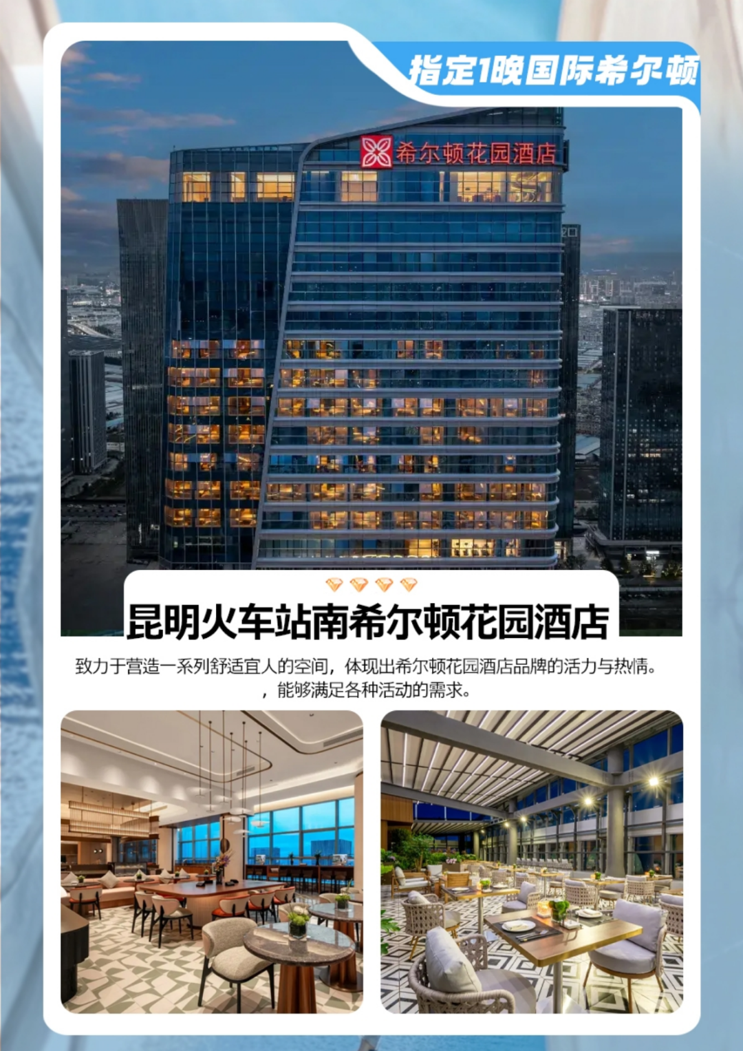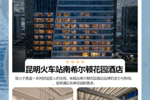 昆明火车站南希尔顿花园, 昆明西山希尔顿惠庭 ,昆明盘龙希尔顿惠庭 ,昆明南站希尔顿欢朋,昆明滇池希尔顿花园。同级(备注酒店不能指定,如遇旺季酒店资源紧张,我社有权对酒店进行调整,并按同级标准安排)