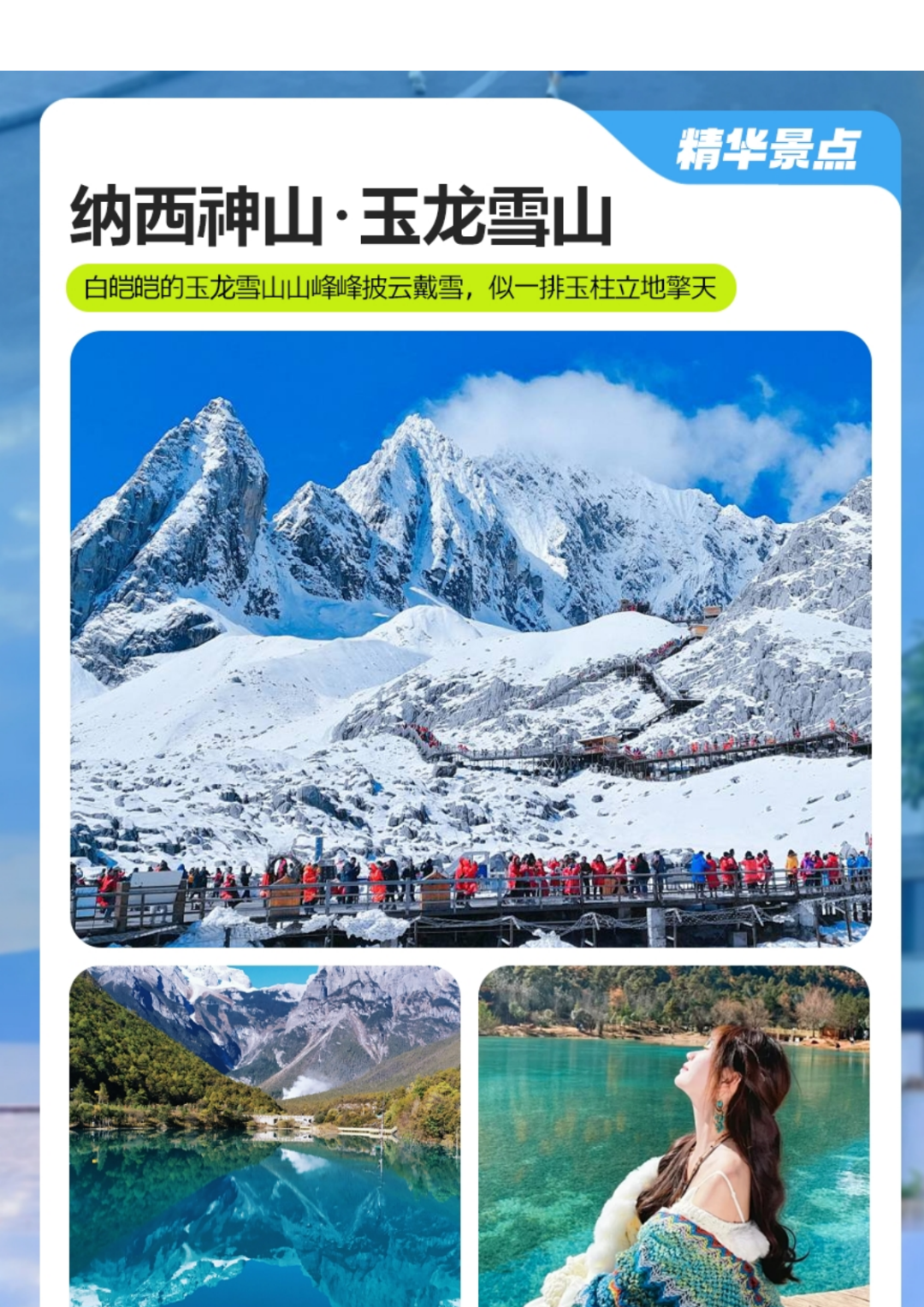 午餐之后前往 “仙人遗田”之称的小九寨沟【蓝月谷】(不含蓝月谷电瓶车费用),其前身为人们所熟知的 “白水河”,蓝月谷又名白水河,在晴天时,水的颜色是蓝色的,而且山谷呈月牙形,远看就象一轮蓝色的月亮镶嵌在玉龙雪山脚下,所以名叫蓝月谷,