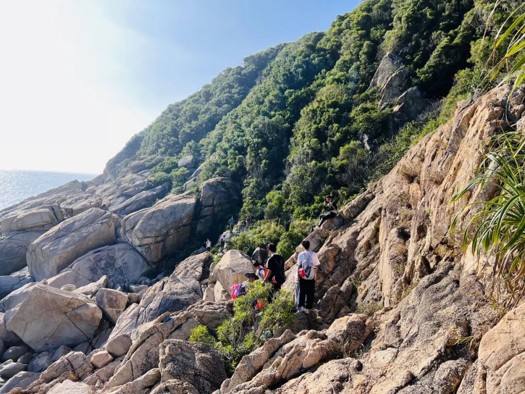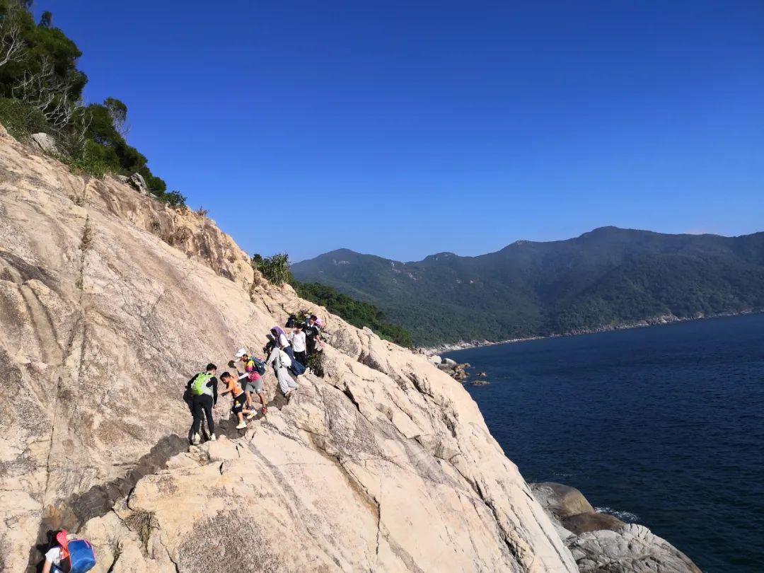 起点西贡村,终点柚柑湾,全程约13公里,起点到沙滩需要走大概3公里的土路,有点爬升。然后一路攀爬海岸线,需要手脚并用。最后有段约6公里的路程,路上车多且没有风景,晚到的队员必须要坐当地私家车到终点大巴处,费用约10元/人(自费)。如果体力好能早到的话可以不用包车自己走到大巴处,用时约1小时。