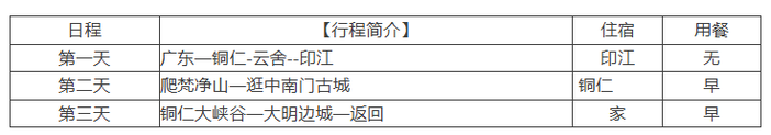 8:00游览铜仁大峡谷(游览时间2.5个小时),峡谷内可进行徒步、高空滑索、激情漂流等多种项目,欣赏“一线天”、“天生桥”等喀斯特地质奇观。